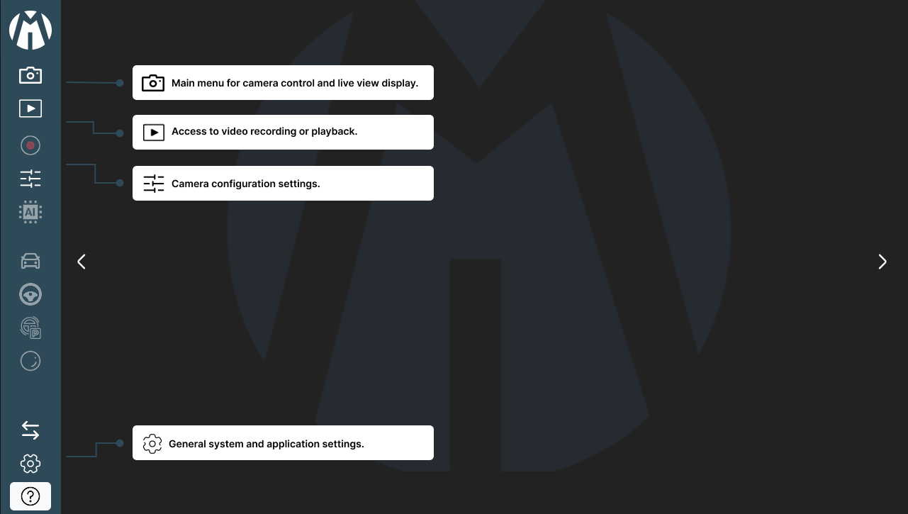 12. Help Mode : Provides guidance on the functions of all buttons in the Sidebar and Live View Control interface, assisting users in understanding the system layout and features.