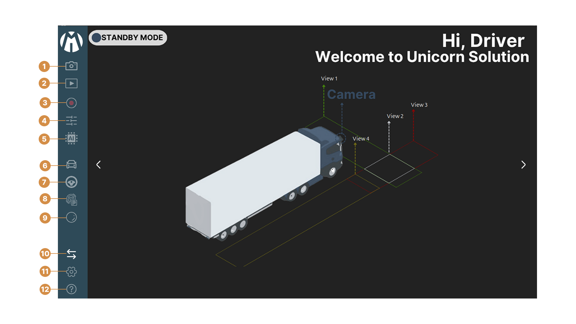 10. Switch Mode : Toggles the application state between "Standby Mode" (monitoring off/idle) and "Drive Mode" (active monitoring).