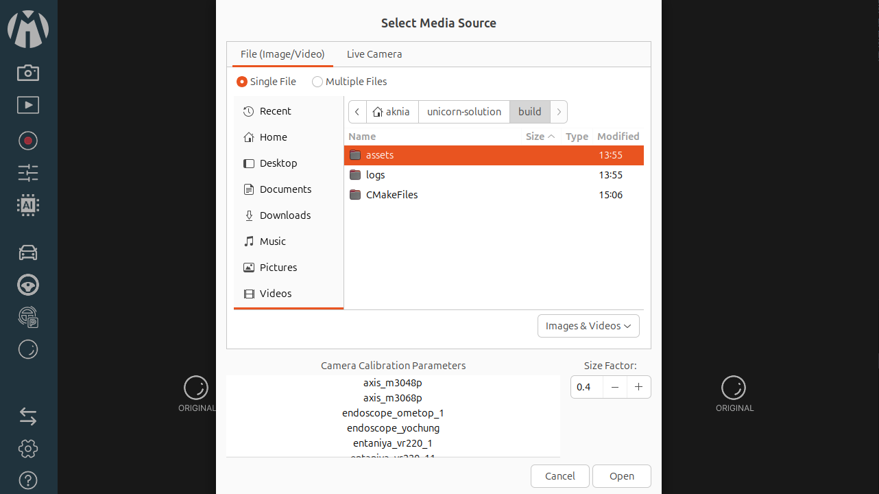 1. Load Media and Open Camera : The UI provides options for loading media and cameras, enabling users to choose between local media files or live camera streams. Users are required to define the source count (Single or Multiple) before selecting the specific file. To ensure accuracy, the appropriate camera parameters must be assigned according to the selected media source.