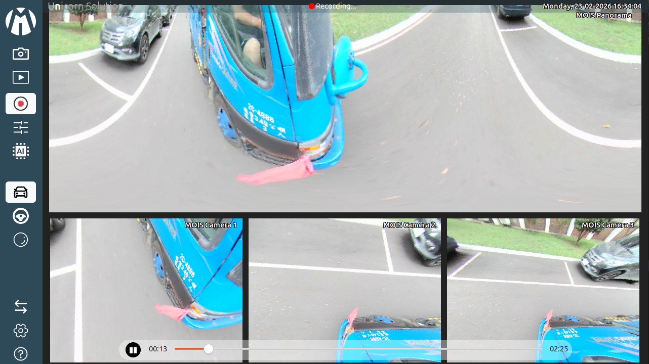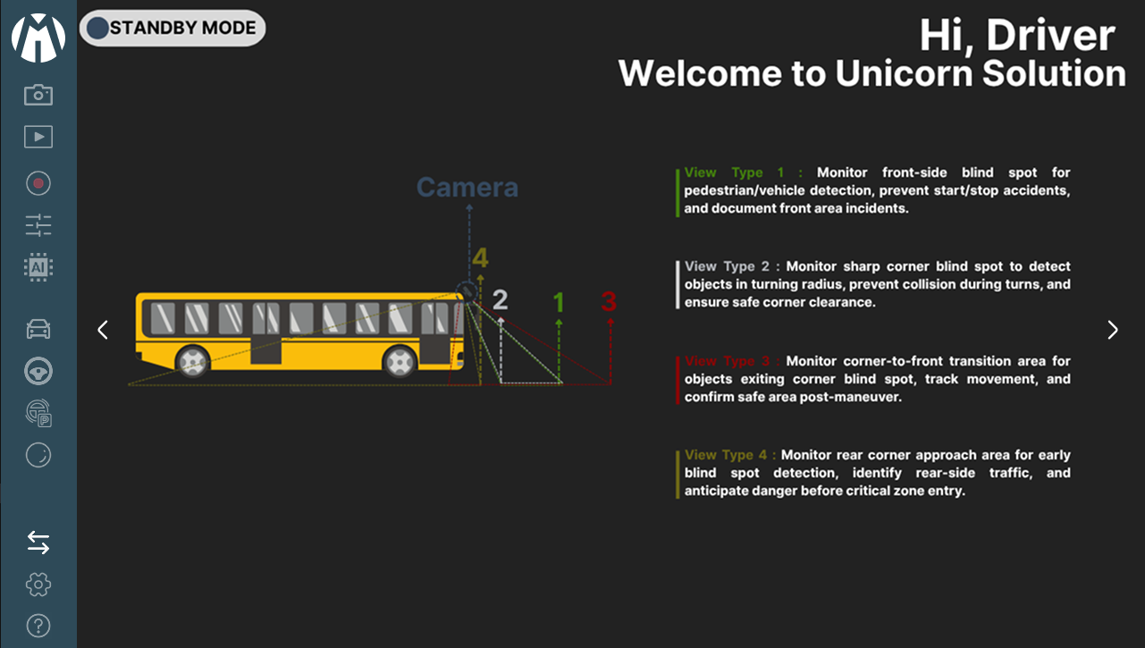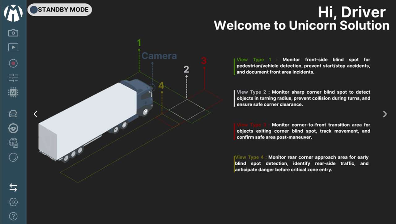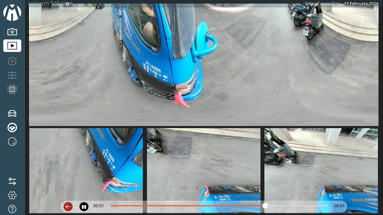 Unicorn Solution is an advanced camera monitoring and visualization application designed for vehicles equipped with fisheye camera systems. The software provides a complete platform for capturing, processing, and displaying wide-angle camera feeds in real time, allowing operators to monitor the vehicle’s surroundings efficiently and safely.