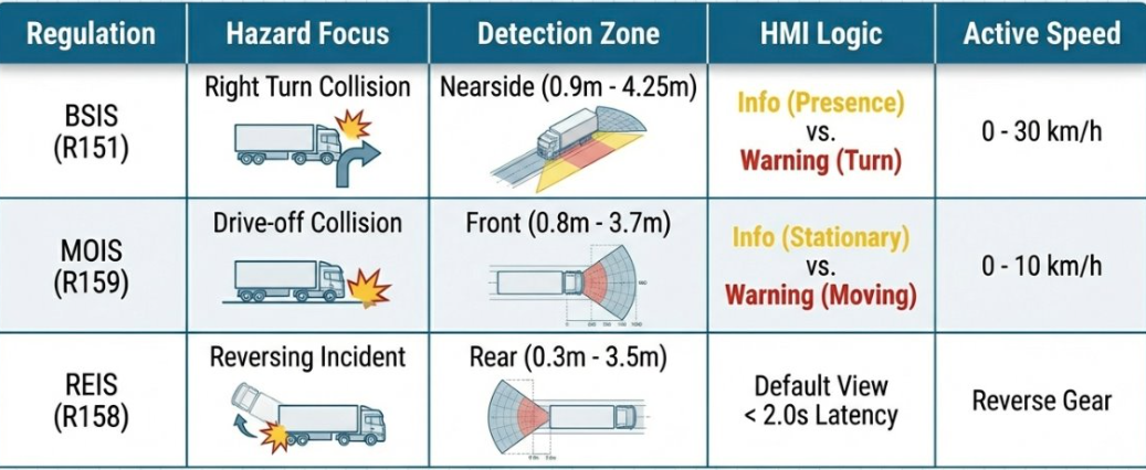 The automotive industry is currently undergoing a transformative Regulatory Shift from passive vision to active detection, driven by the EU General Safety Regulation (GSR) 2019/2144 which prioritizes the safety of Vulnerable Road Users (VRUs). This transition is anchored by a "Trinity of Regulation" consisting of UN ECE R151 (BSIS) for mitigating nearside right-turn collisions at speeds up to $30 km/h, UN ECE R159 (MOIS) for preventing drive-off accidents at the front of the vehicle up to $10 km/h, and UN ECE R158 (REIS) for ensuring visibility and safety during reversing maneuvers. By evolving from traditional mirrors to Camera Monitor Systems (CMS) and eventually to Active Detection using sensor fusion and AI, these standards provide a comprehensive compliance framework with specific detection zones and HMI logic to provide real-time proactive alerts to drivers.